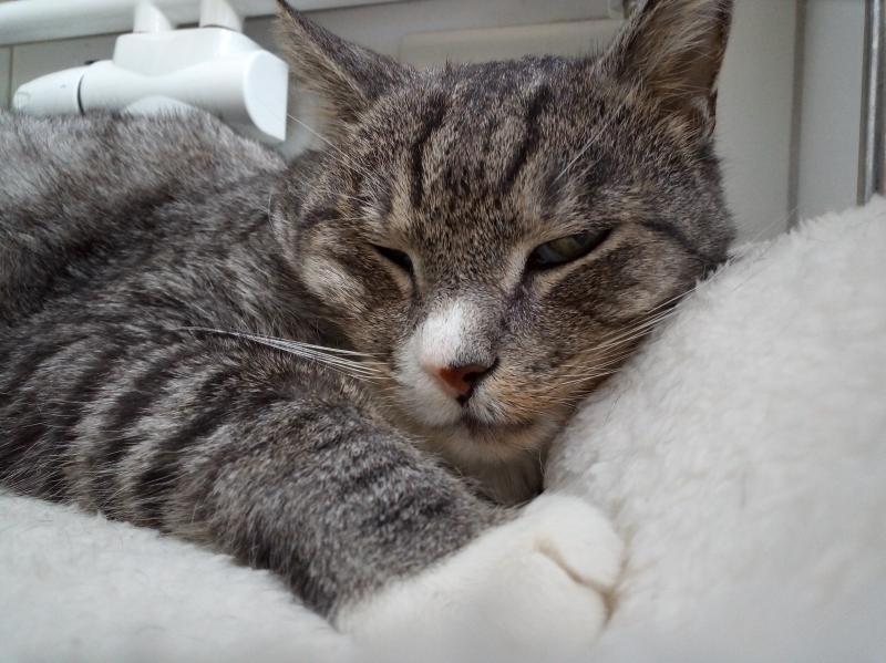 Auch sein Problem mit dem ständigen Erbrechen ist viel besser geworden. Ich schicke Ihnen gleich noch ein aktuelles Foto von ihm auf seinem Lieblingsplatz (im Badezimmer, da gibt es nämlich eine Fussbodenheizung)