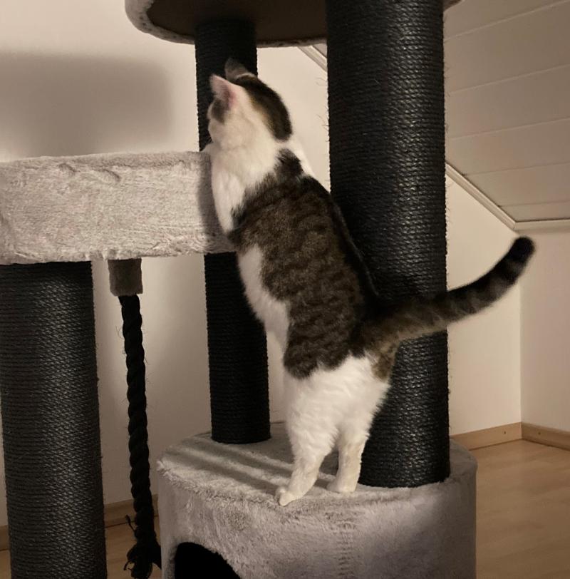 Ich habe einen tollen Kratzbaum zum Klettern, Spielen und Ausruhen. Es gibt immer gutes Essen und viel zu entdecken.