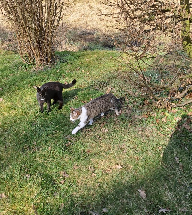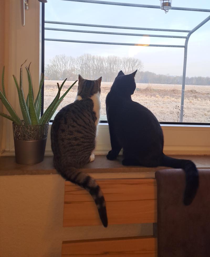 wir haben am 12.02.25 Sanno und Helene aus dem Tierheim abgeholt. Die beiden waren die Notfelle, da sie schon sehr lange ein neues Zuhause gesucht haben. Außerdem gab es bei dem schwarzen Kater Sanno ein kleines Problem, wie uns die Tierpflegerin erzählte. Er dreht sich immer im Kreis wenn er aufgeregt ist oder Angst hat. Wir haben das Ganze sehr gelassen gesehen und uns darauf eingestellt. Bei uns zuhause angekommen hat er sich dann zweimal rechts und zweimal links gedreht, das wars, also nichts Schlimmes. Wenn es Futter gibt, dreht er sich immer noch vor Aufregung im Kreis, aber wir sehen das als eine liebenswerte Macke. Die ersten beiden Tage waren dann wirklich sehr aufregend. Die neue Umgebung musste erkundet werden. Das war wohl so angstrengend, dass der 3. Tag fast komplett verschlafen wurde. Die kleine weiß getigerte Katze Helene, bei uns heißt sie jetzt Nelly war von Anfang an sehr zutraulich und ließ sich streicheln. Sanno ließ sich am Anfang garnicht anfassen, aber bereits am 4. Tag ließ er sich beim Fressen über den Rücken streicheln. Und nach einer Woche kam er schon von selber an und wollte gestreichelt werden. Man durfte ihn aber nicht anfassen, wenn er irgendwo gelegen hat. Jetzt nach fast 4 Wochen, darf man ihn auch da streicheln und er lässt sich gerne den Hals und Kopf kraulen, aber nicht zu lange. Natürlich wird auch immer ordentlich getobt, der Platz ist ja auch da. Die beiden sind wirklich sehr verspielt und jagen sich durch die ganze Wohnung, da ist auch schon mal ein Stuhl umgeflogen und Blumentöpfe runter gefallen. Aber nun ja, es sind ja Katzenkinder und die probieren alles aus. Verschiedene Schlafplätze wurden ausprobiert, Sanno findet das Regal im Telefonschränkchen ganz toll. Und Nelly hat heraus gefunden, dass man sich vor dem Staubsauger am besten hinter dem Sofa verstecken kann.