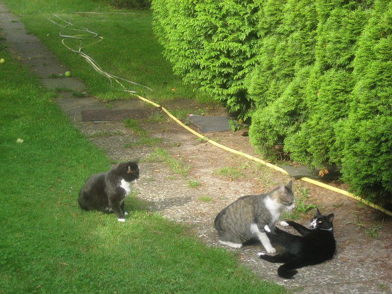 Felix und Thommy dagegen bolzen viel rum, sofern sie ihre fünf Minuten bekommen jagen sie sich gegenseitig durch den Garten. Pino schaut sich das alles in Ruhe an und tobt nur mit, wenn er das will. Meist verzieht er sich lieber auf den Apfelbaum und schaut sich die Bolzerei von oben an. Dabei sein ist alles, meint PINO. Felix seine Lieblingsbeschäftigung ist nunmal mit Thommy zu bolzen. Da ist er der Chef und Thommy der sogen. Lakai. Ihre Herachieordnung war das erste im Sommer, was wir unter den drei Katers beobachteten. Wir stellten fest: Felix ist der CHEF-CHEF, PINO ist nur CHEF und Thommy muß für alles herhalten, ist aber auch Koordinator, und der sogenannte Taschenträger für die Chefs bzw. bestimmt die Regeln, was gemacht wird.