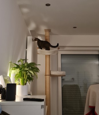 Tobi hat sich bis jetzt als sehr kinderfreundlich gezeigt und liegt auch bei lauten kinder gespielt am liebsten mit im Raum auf der Fensterbank oder auf dem Schrank und schaut den Kindern entspannt zu.