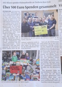 Die tierlieben Schüler sammelten bei einem Flohmarkt eine wahnsinns Geldspende von 520 Euro, die sie uns heute überreichten.